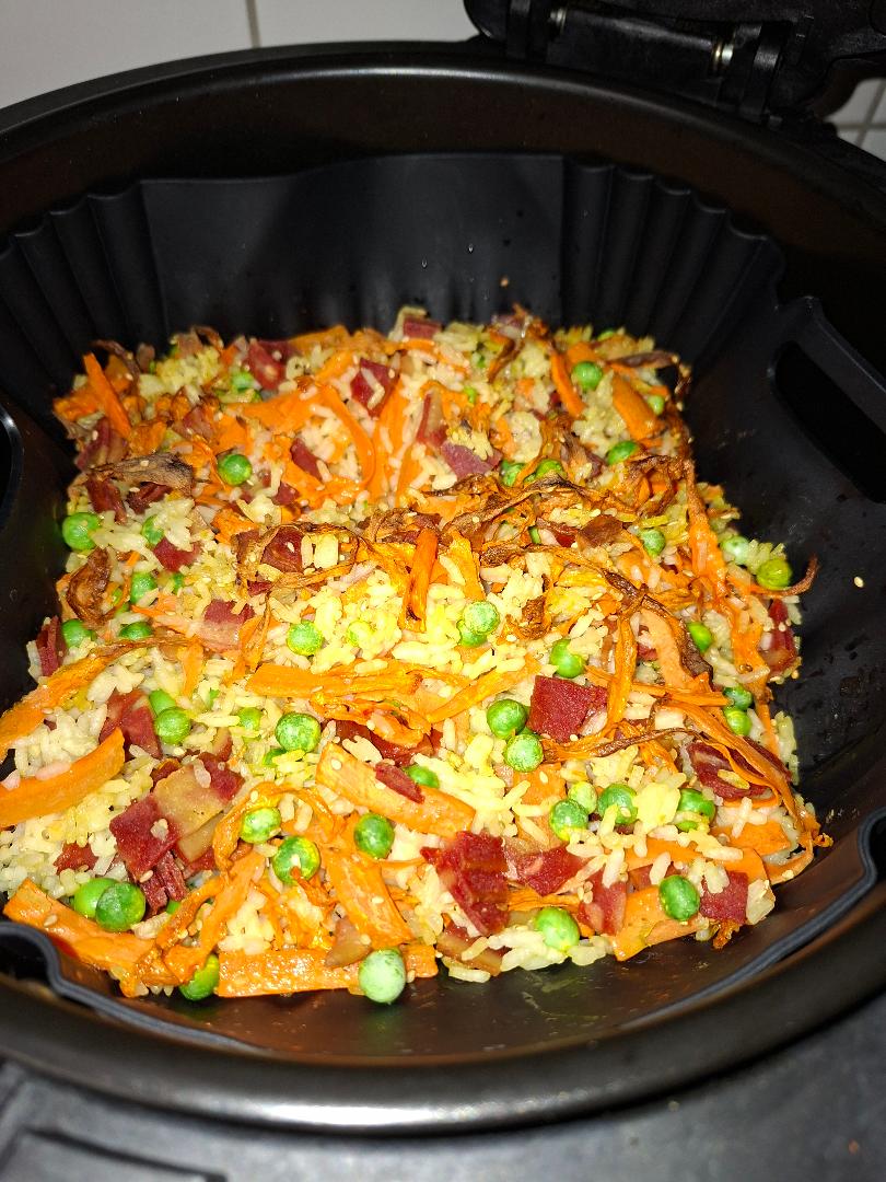 Als zweites habe ich Bratreis mit veganen Baconstreifen gemacht.